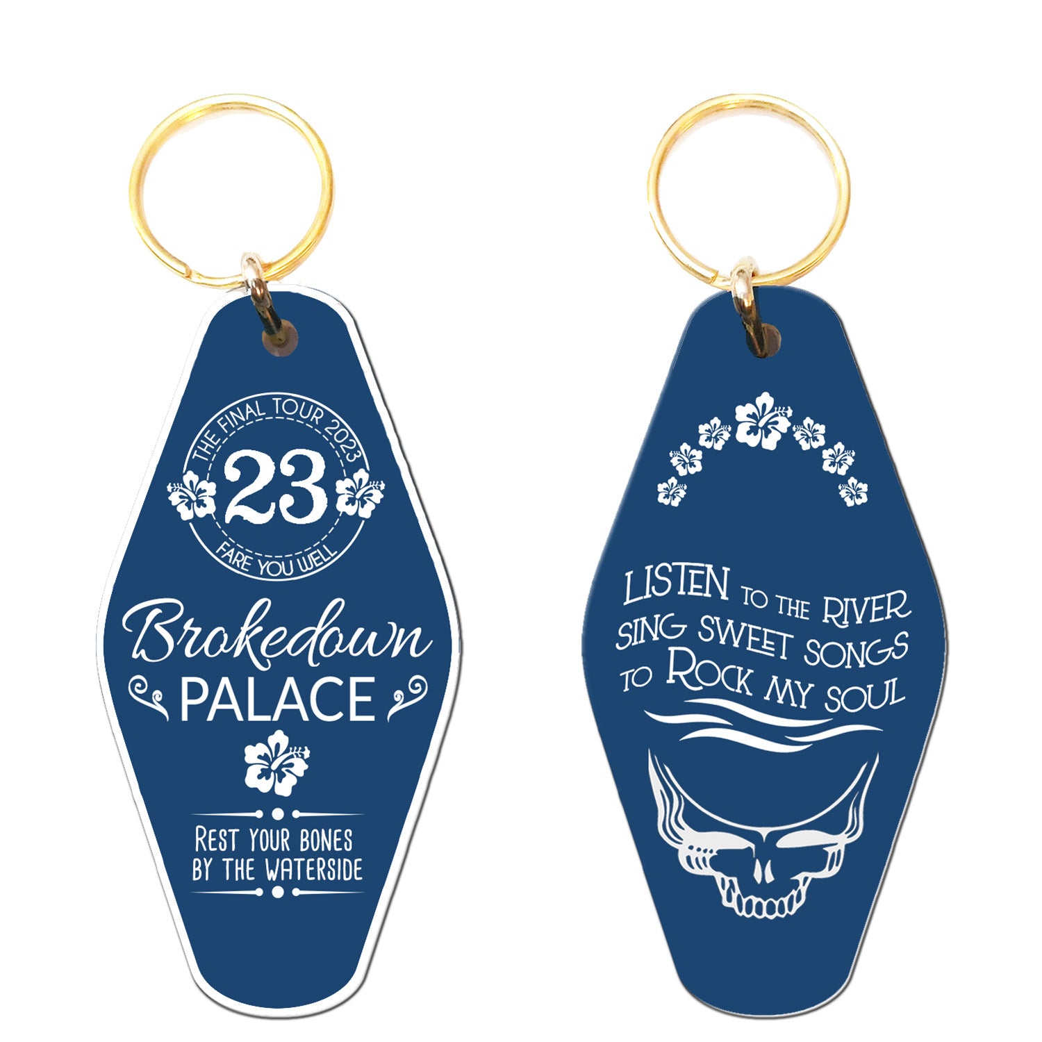I chose lyrics that evoke the collective mystery and unknown future without a version of the Dead in our lives. After years of shows, we’ve all “been there so long we’ve got to calling it home.” As this band has evolved so has our experience of it, from my first show back in the 1980s to my last one, they do “all melt into a dream.” We all process change in our own unique ways, some look for information, look for clues to the future, “tell me all that you know” help me fill in the blank of the unknown. Other folks will dig in to the mystery and ask “is this the end or beginning.” Some will offer advice, “laugh, in the sunshine, sing, cry in the dark, fly through the night. In addition to the lyrics and their meanings these keychains give us something to “hold on to” as we listen to the “sweet songs, to rock [our] souls.